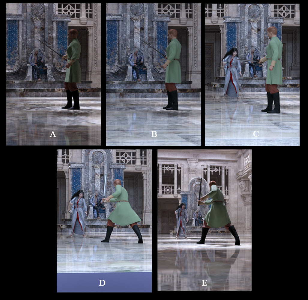 D. Brightened the scene a bit more and changed Hahven’s pose. Much more dynamic… but forgot to use DForce on the clothes to get them to lay naturally. Not a fan of the lighting. Also, accidentally angled the camera wrong and ended up with the purple blotch where the floor ended.