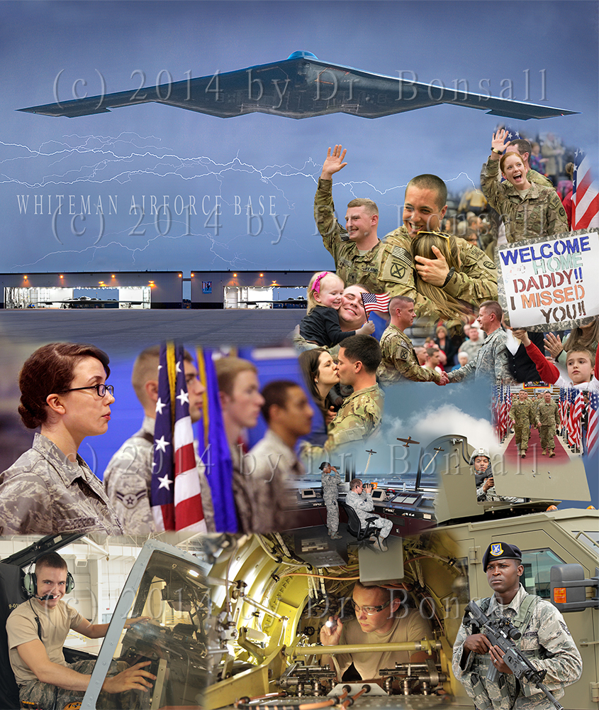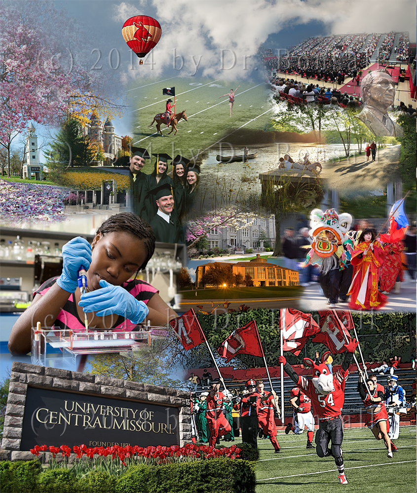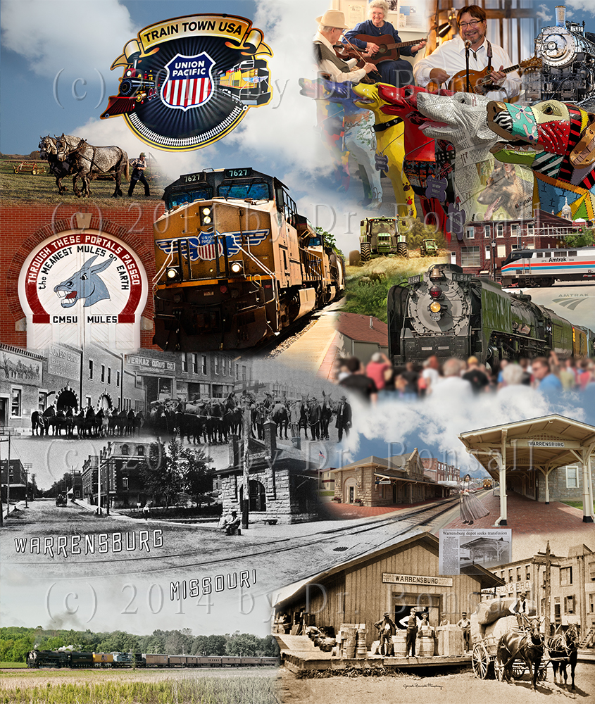 This project lasted approximately 18 months (April 2013 through October 2014). Dr. Bonsall directed the project, and the majority of the photos are hers. Other contributing photographers include: Robert Breshears, Andrew Mather, Bryan Tebbenkamp, Lowell Toole and Tricia Mannering, and special thanks goes to: Denton Humphrey, Lisa Irle, Brett Penrose, Courtney Stephens, Lisa Schmidt, Paula Hertwig Hopkins, UCM Photographic Services and Johnson County Historical Society.  The canvas was printed by Jerry Schmidt, and I did the computer artistry of blending all the images together. The mural currently resides in the Warrensburg, MO city hall.
