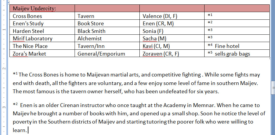 Enen’s Study and Zora’s Market are the primary characters and locations I pulled for The Wind Mage of Maijev, though Cross Bones does get a brief reference.