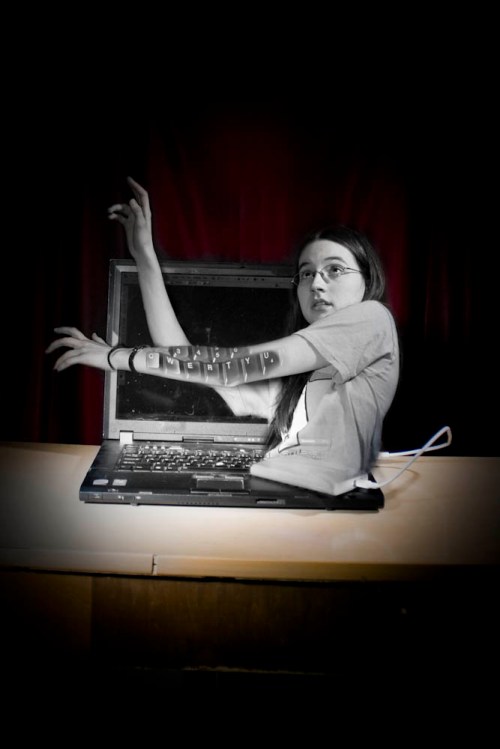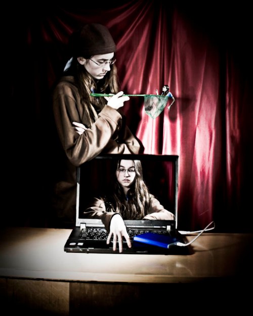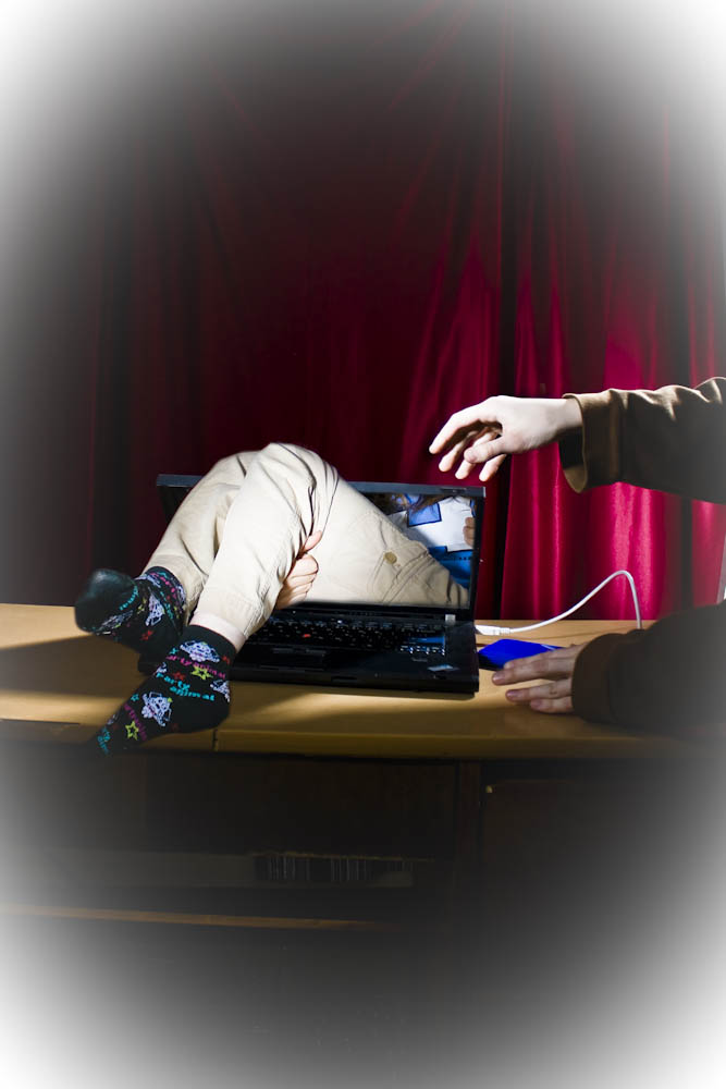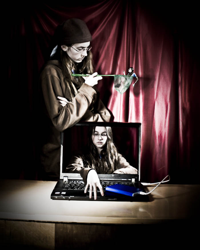 Our first assignment in Creative Photography was self-portrait work. I decided I would make digital manipulation my key focus. So I set up studio in the currently empty other half of my dorm room using two Alien B400 lights and a grid spot, along with a piece of red fabric safety-pinned to the curtains, and took various pictures. Most of them were shot with a continuous shot ten-second timer. Several of the base photos turned out blurry, but after a couple shots they finally came out right. I also took several photos of my laptop. Then, in order to get the “fish-in-the-net” photos, I asked my boyfriend for help holding me- and giving me a chance to take up random poses. Granted, the expressions on my face wasn’t entirely an act, since being held precariously over a desk isn’t exactly my favorite thing to do. In the end some of those poses helped for the “falling-into-the-laptop” pictures, as well as the one where I am coming out of the laptop’s portable hardrive. It was a fun shoot, and I think the results turned out interesting.