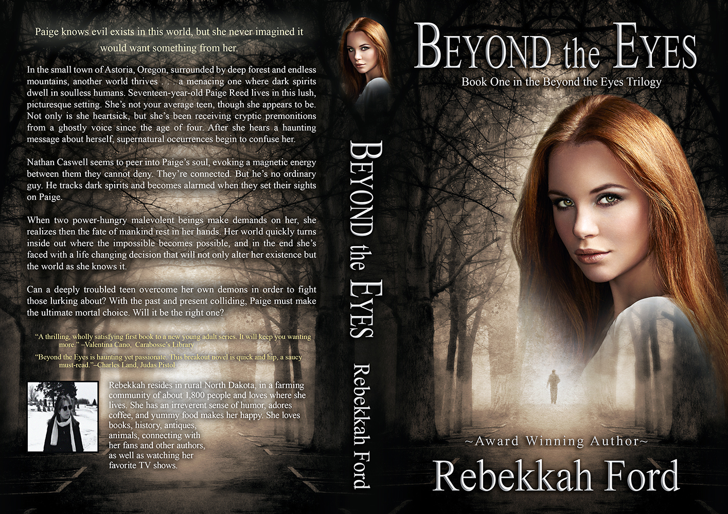All photos are my own (except the photo of the girl, which was taken by my husband, Isaac). Originally it was just going to be the dark spirit and the body at its feet, but Rebekkah and I decided the cover needed something to give it just a bit more of a young adult feel. I started by looking through stock sites, but realized it was extremely hard to find a non-cheesy person looking terrified or running in fear. So, my husband (who was standing behind me at the time) asked me to read the description of Paige (the main character). I did, and he pointed out that I could work my “Photoshop Magic” to give the girl red hair… and half an hour later I found myself posing as the MC. Random fact of the photoshoot. Anyways, this is the final wrap-around cover. 😀